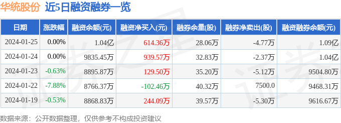 华统股份融资融券信息显示,融资方面,当日融资买入771.1万元,融资偿还156.74万元,融资净买入614.36万元,连续3日净买入累计1683.44万元。融券方面,融券卖出9500.0股,融券偿还5.72万股,融券余量28.06万股,融券余额485.4万元。融资融券余额1.09亿元。近5日融资融券数据一览见下表:
