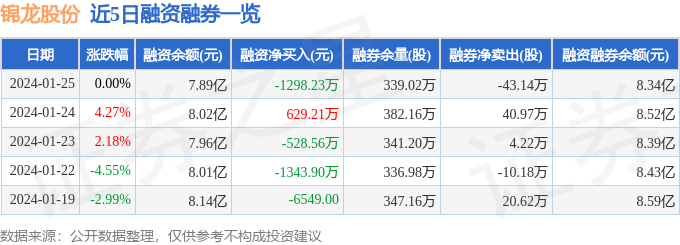 锦龙股份融资融券信息显示,融资方面,当日融资买入4261.37万元,融资偿还5559.6万元,融资净偿还1298.23万元。融券方面,融券卖出33.87万股,融券偿还77.01万股,融券余量339.02万股,融券余额4475.11万元。融资融券余额8.34亿元。近5日融资融券数据一览见下表: