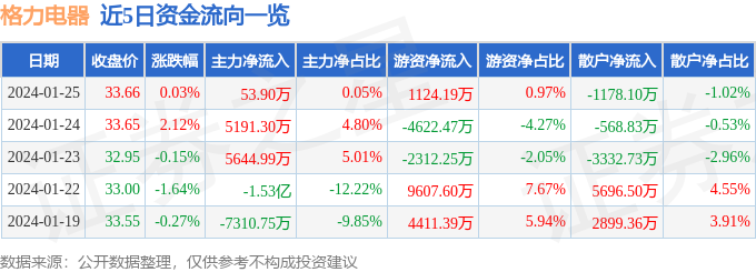 财经消息,截至2024年1月25日收盘,格力电器(000651)报收于33.66元,上涨0.03%,换手率0.61%,成交量34.3万手,成交额11.54亿元。