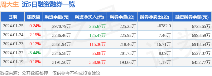 周大生融资融券信息显示,融资方面,当日融资买入222.33万元,融资偿还488.01万元,融资净偿还265.67万元。融券方面,融券卖出2.9万股,融券偿还3.58万股,融券余量225.25万股,融券余额3754.86万元。融资融券余额6725.65万元。近5日融资融券数据一览见下表: