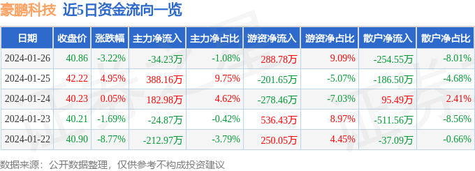 豪鹏科技(001283)1月26日主力资金净卖出34.23万元