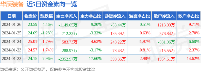 财经消息,截至2024年1月26日收盘,华辰装备(300809)报收于23.59元,下跌4.46%,换手率4.42%,成交量5.23万手,成交额1.25亿元。