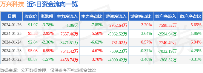 万兴科技(300624)1月26日主力资金净卖出1.06亿元