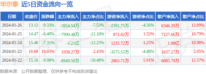 华尔泰(001217)1月26日主力资金净卖出3954.54万元