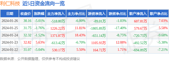 财经消息,截至2024年1月26日收盘,利仁科技(001259)报收于30.16元,下跌5.01%,换手率13.05%,成交量2.86万手,成交额8647.86万元。