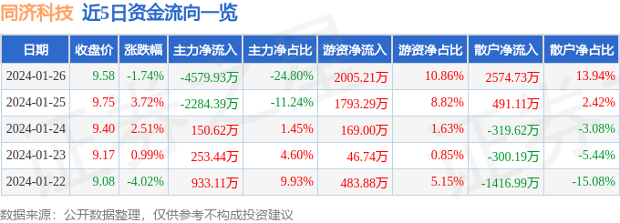 股票行情快报:同济科技(600846)1月26日主力资金净卖出4579.93万元