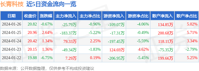 股票行情快报:长青科技(001324)1月26日主力资金净卖出25.79万元