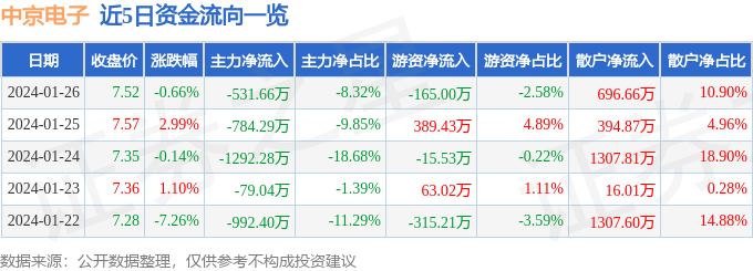 股票行情快报:中京电子(002579)1月26日主力资金净卖出531.66万元