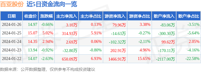 股票行情快报:百亚股份(003006)1月26日主力资金净买入3.10万元