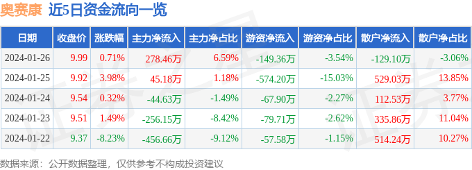 财经消息,截至2024年1月26日收盘,奥赛康(002755)报收于9.99元,上涨0.71%,换手率0.45%,成交量4.19万手,成交额4223.93万元。