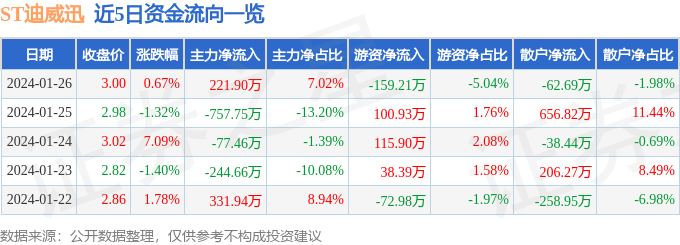 股票行情快报:ST迪威迅(300167)1月26日主力资金净买入221.90万元