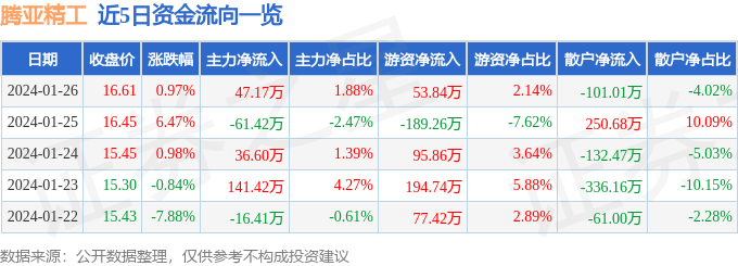 股票行情快报:腾亚精工(301125)1月26日主力资金净买入47.17万元