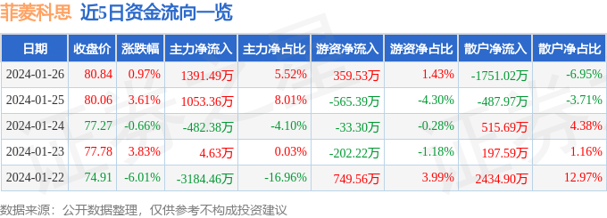 财经消息,截至2024年1月26日收盘,菲菱科思(301191)报收于80.84元,上涨0.97%,换手率11.68%,成交量3.05万手,成交额2.52亿元。