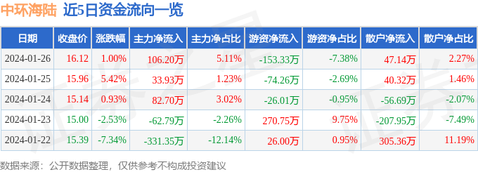 股票行情快报:中环海陆(301040)1月26日主力资金净买入106.20万元