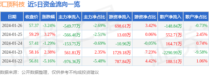 汇顶科技(603160)1月26日主力资金净卖出549.77万元