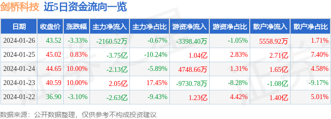 1月26日的资金流向数据方面,主力资金净流出2160.52万元,占总成交额0.67%,游资资金净流出3398.4万元,占总成交额1.05%,散户资金净流入5558.92万元,占总成交额1.71%。