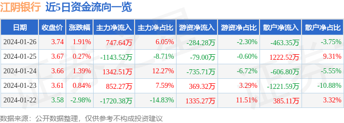 股票行情快报:江阴银行(002807)1月26日主力资金净买入747.64万元