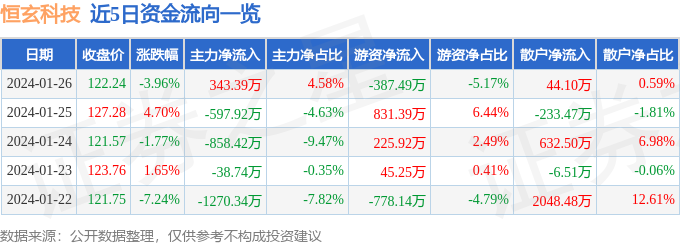 财经消息,截至2024年1月26日收盘,恒玄科技(688608)报收于122.24元,下跌3.96%,换手率0.5%,成交量6059.0手,成交额7489.49万元。