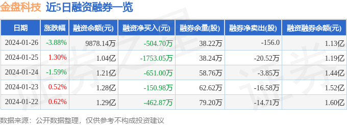 金盘科技融资融券信息显示,融资方面,当日融资买入622.61万元,融资偿还1127.31万元,融资净偿还504.7万元。融券方面,融券卖出1.74万股,融券偿还1.76万股,融券余量38.22万股,融券余额1429.18万元。融资融券余额1.13亿元。近5日融资融券数据一览见下表: