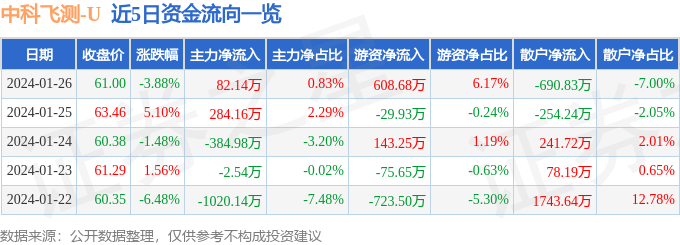 财经消息,截至2024年1月26日收盘,中科飞测(688361)报收于61.0元,下跌3.88%,换手率2.46%,成交量1.6万手,成交额9868.72万元。