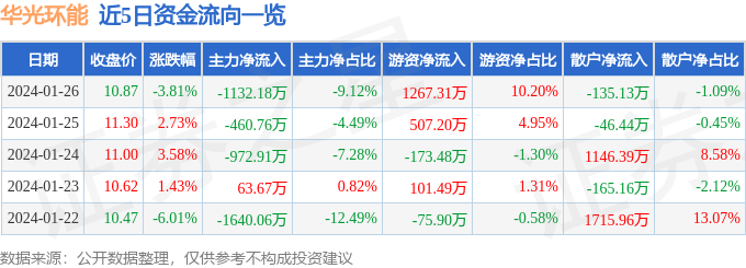 华光环能(600475)1月26日主力资金净卖出1132.18万元