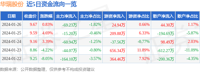 股票行情快报:华瑞股份(300626)1月26日主力资金净卖出69.23万元