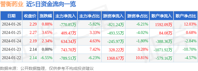 股票行情快报:誉衡药业(002437)1月26日主力资金净卖出770.85万元