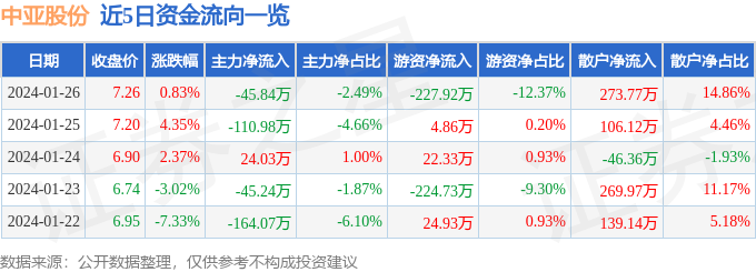 股票行情快报:中亚股份(300512)1月26日主力资金净卖出45.84万元