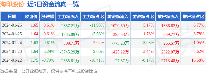 财经消息,截至2024年1月26日收盘,海印股份(000861)报收于1.65元,上涨0.61%,换手率5.0%,成交量119.45万手,成交额1.97亿元。