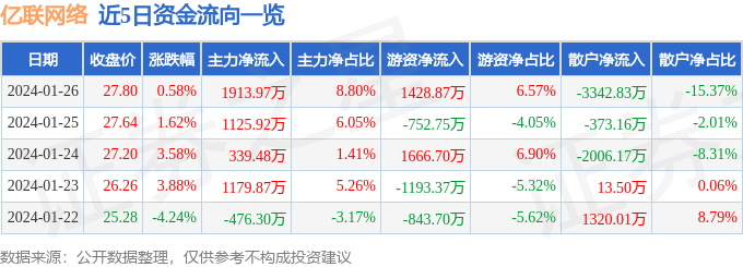1月26日的资金流向数据方面,主力资金净流入1913.97万元,占总成交额8.8%,游资资金净流入1428.87万元,占总成交额6.57%,散户资金净流出3342.83万元,占总成交额15.37%。