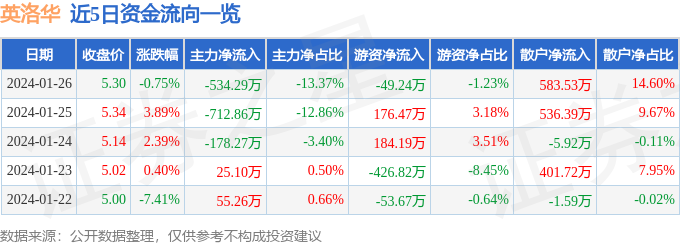 股票行情快报:英洛华(000795)1月26日主力资金净卖出534.29万元