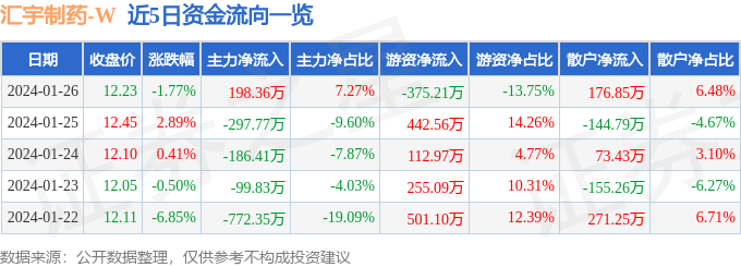 股票行情快报:汇宇制药(688553)1月26日主力资金净买入198.36万元