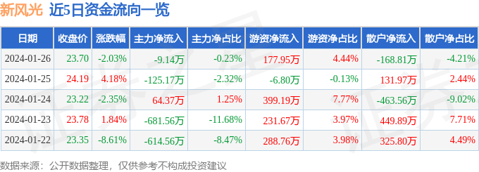 股票行情快报:新风光(688663)1月26日主力资金净卖出9.14万元