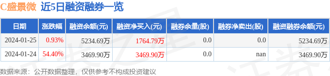 C盛景微融资融券信息显示,融资方面,当日融资买入3596.58万元,融资偿还1831.79万元,融资净买入1764.79万元,连续3日净买入累计5234.69万元。融券方面,融券卖出0.0股,融券偿还0.0股,融券余量0.0股,融券余额0.0万元。融资融券余额5234.69万元。近5日融资融券数据一览见下表: