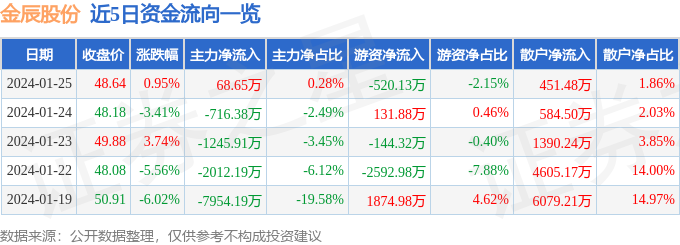金辰股份(603396)1月25日主力资金净买入68.65万元