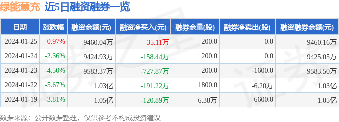 绿能慧充融资融券信息显示,融资方面,当日融资买入365.31万元,融资偿还330.2万元,融资净买入35.11万元。融券方面,融券卖出0.0股,融券偿还0.0股,融券余量200.0股,融券余额0.13万元。融资融券余额9460.16万元。近5日融资融券数据一览见下表: