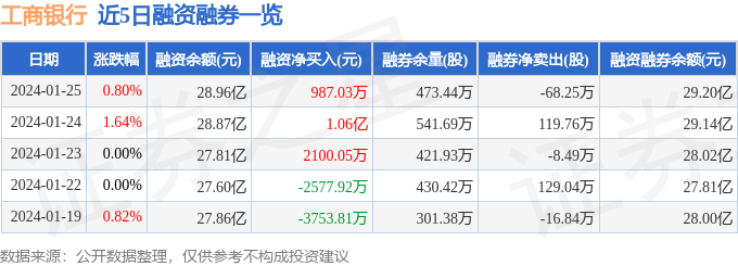 财经消息,截至2024年1月25日收盘,工商银行(601398)报收于5.01元,上涨0.8%,换手率0.13%,成交量343.76万手,成交额17.21亿元。