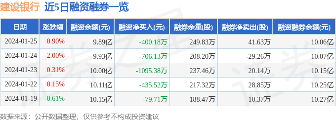 建设银行融资融券信息显示,融资方面,当日融资买入1808.78万元,融资偿还2208.96万元,融资净偿还400.18万元。融券方面,融券卖出62.96万股,融券偿还21.33万股,融券余量249.83万股,融券余额1673.84万元。融资融券余额10.06亿元。近5日融资融券数据一览见下表:
