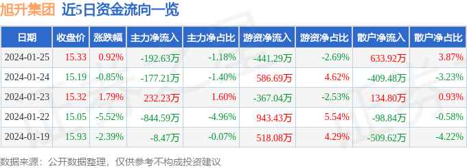 财经消息,截至2024年1月25日收盘,旭升集团(603305)报收于15.33元,上涨0.92%,换手率1.15%,成交量10.7万手,成交额1.64亿元。