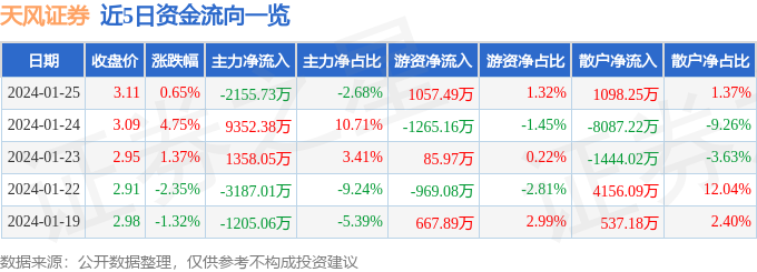 天风证券(601162)1月25日主力资金净卖出2155.73万元