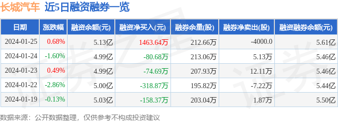 长城汽车融资融券信息显示,融资方面,当日融资买入2583.6万元,融资偿还1119.96万元,融资净买入1463.64万元。融券方面,融券卖出1.85万股,融券偿还2.25万股,融券余量212.66万股,融券余额4742.27万元。融资融券余额5.61亿元。近5日融资融券数据一览见下表: