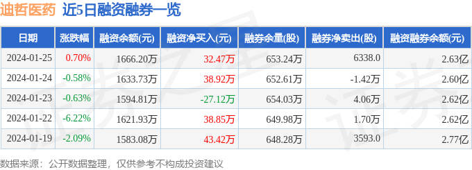 迪哲医药融资融券信息显示,融资方面,当日融资买入188.54万元,融资偿还156.07万元,融资净买入32.47万元。融券方面,融券卖出2.22万股,融券偿还1.59万股,融券余量653.24万股,融券余额2.46亿元。融资融券余额2.63亿元。近5日融资融券数据一览见下表: