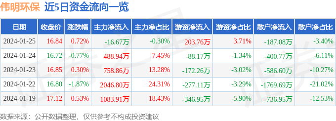 伟明环保(603568)1月25日主力资金净卖出16.67万元