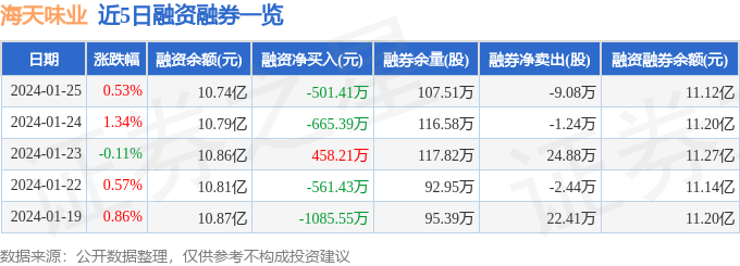 海天味业融资融券信息显示,融资方面,当日融资买入1630.65万元,融资偿还2132.06万元,融资净偿还501.41万元。融券方面,融券卖出8.47万股,融券偿还17.55万股,融券余量107.51万股,融券余额3850.93万元。融资融券余额11.12亿元。近5日融资融券数据一览见下表: