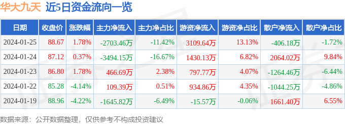 1月25日的资金流向数据方面,主力资金净流出2703.46万元,占总成交额11.42%,游资资金净流入3109.64万元,占总成交额13.13%,散户资金净流出406.18万元,占总成交额1.72%。