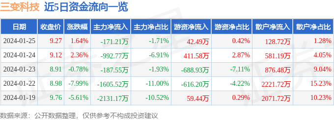 财经消息,截至2024年1月25日收盘,三变科技(002112)报收于9.27元,上涨1.64%,换手率4.18%,成交量10.95万手,成交额1.0亿元。