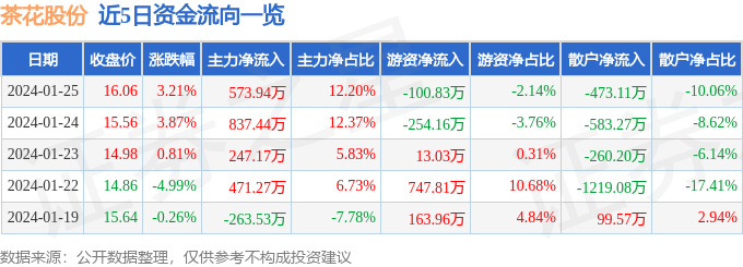 股票行情快报:茶花股份(603615)1月25日主力资金净买入573.94万元
