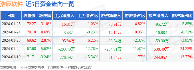 股票行情快报:浩辰软件(688657)1月25日主力资金净买入16.81万元