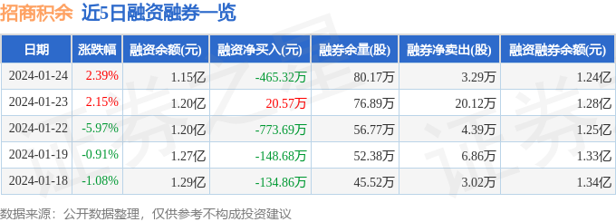 招商积余融资融券信息显示,融资方面,当日融资买入292.29万元,融资偿还757.61万元,融资净偿还465.32万元。融券方面,融券卖出8.53万股,融券偿还5.24万股,融券余量80.17万股,融券余额857.87万元。融资融券余额1.24亿元。近5日融资融券数据一览见下表: