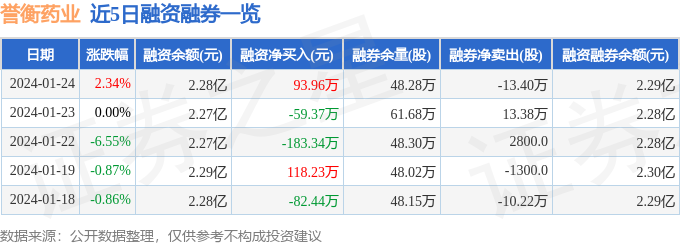 誉衡药业融资融券信息显示,融资方面,当日融资买入598.51万元,融资偿还504.55万元,融资净买入93.96万元。融券方面,融券卖出1.53万股,融券偿还14.93万股,融券余量48.28万股,融券余额105.73万元。融资融券余额2.29亿元。近5日融资融券数据一览见下表: